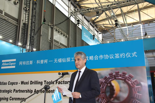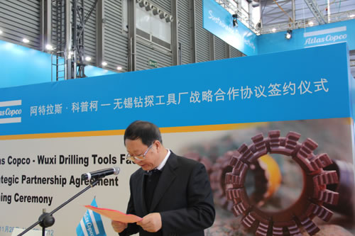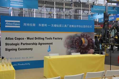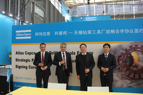 28 ноября 2012 года , на Шанхайской китайской выставке Bauma, руководство завода бурильного инструмента Wuxi, совместно с руководством Геотехнической Бурильной и Разведовательной компании Atlas Copco провели подписание документа о стратегическом сотрудничестве . Виктор Тапиа президент Геотехнической Бурильной и Разведовательной компании Atlas Copco; Вень Янчжи, генеральный директор Горнодобывающего и Экскавационного Подразделения Atlas Copco и Китайского Отделения Компании; Гуань Цзень, Председатель Головного Оффиса Китайского Геологического Оборудования и директор завода бурильного инструмента Wuxi , Гао Шеньёу , выступили в указанном порядке.Данное сотрудничество дополнит китайский рынок компании Atlas Copco и повысит конкурентоспособность завода бурильного инструмента Wuxi на рынке DCDMA.С двусторонним расширением рынка , Atlas Copco и завод бурильного инструмента Wuxi предпологают рост продаж оборудования для бурения.